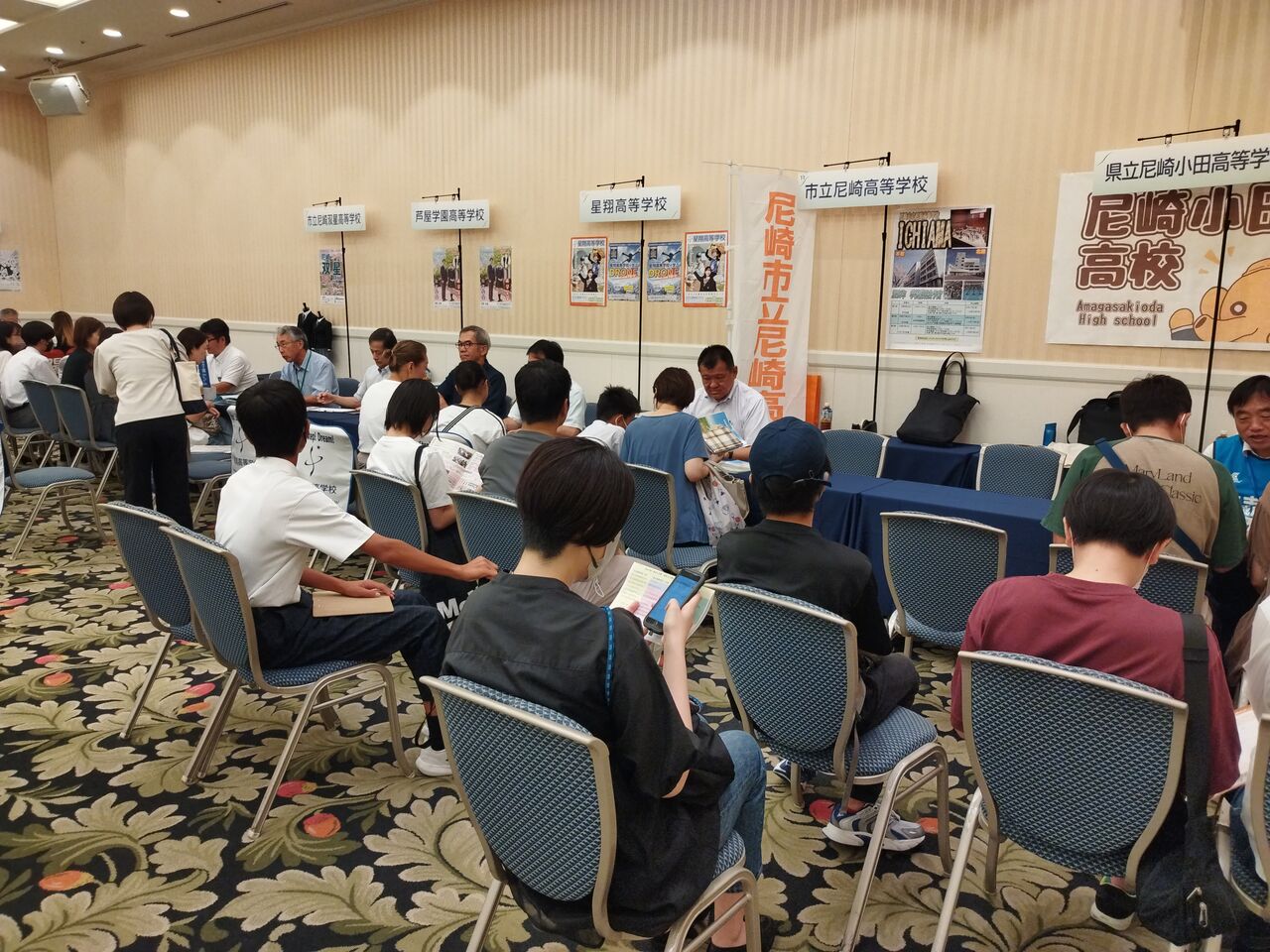 広い会場に各私立高校の先生たちが机を並べて待っています。