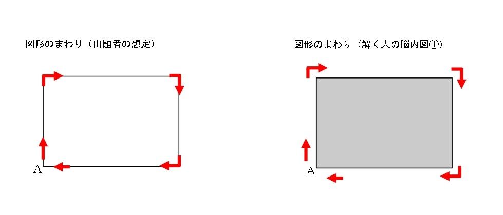 出題者の想定ではさっきの問題は3+5+3+5=16cmが答えなのですが、解く人が上の図の(脳内図①)みたいに考えていると、「長方形からどれぐらい離れて周るんだろう」と考えてフリーズしているのかも知れません。そりゃ解けないね(涙)