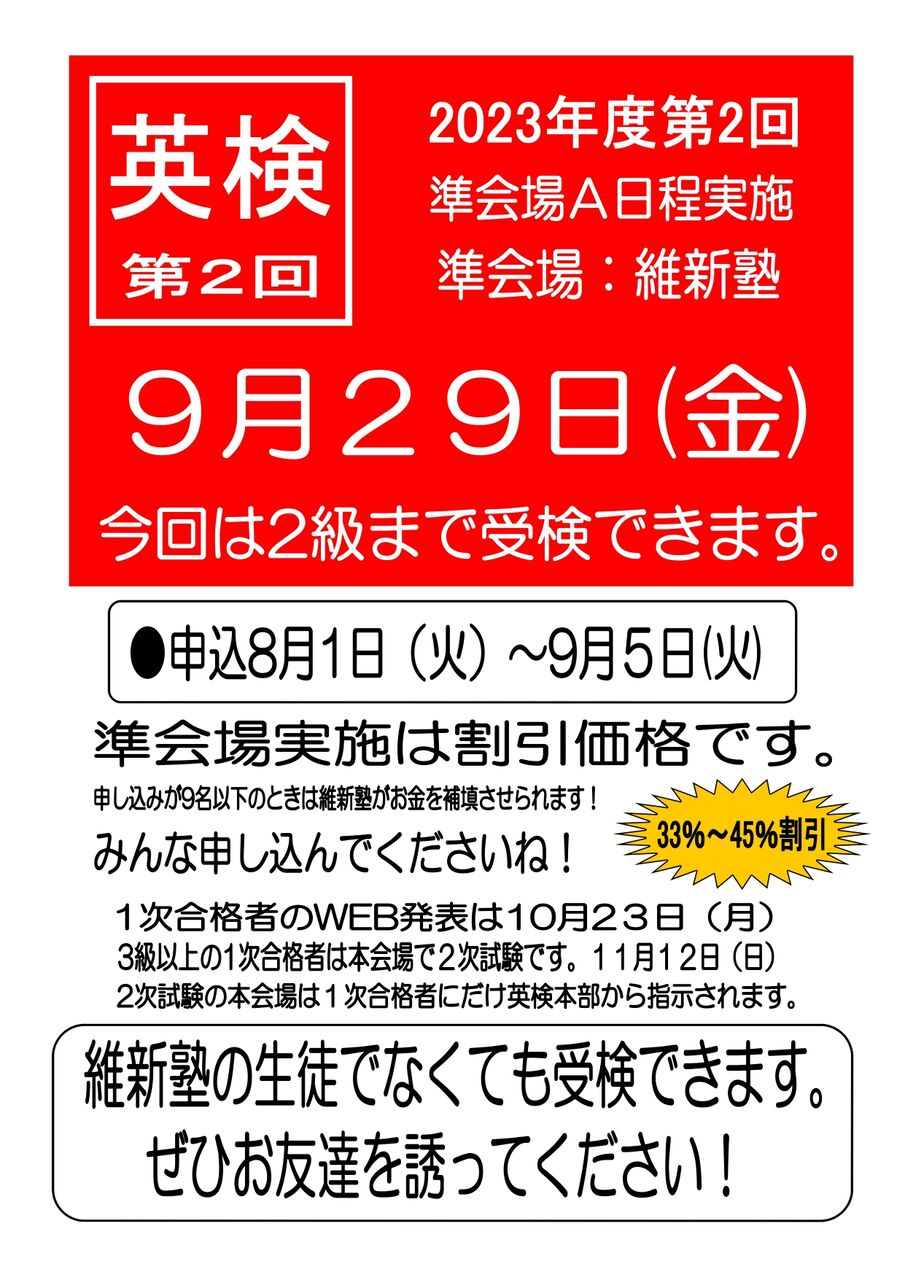 英検 9月29日(金)募集中